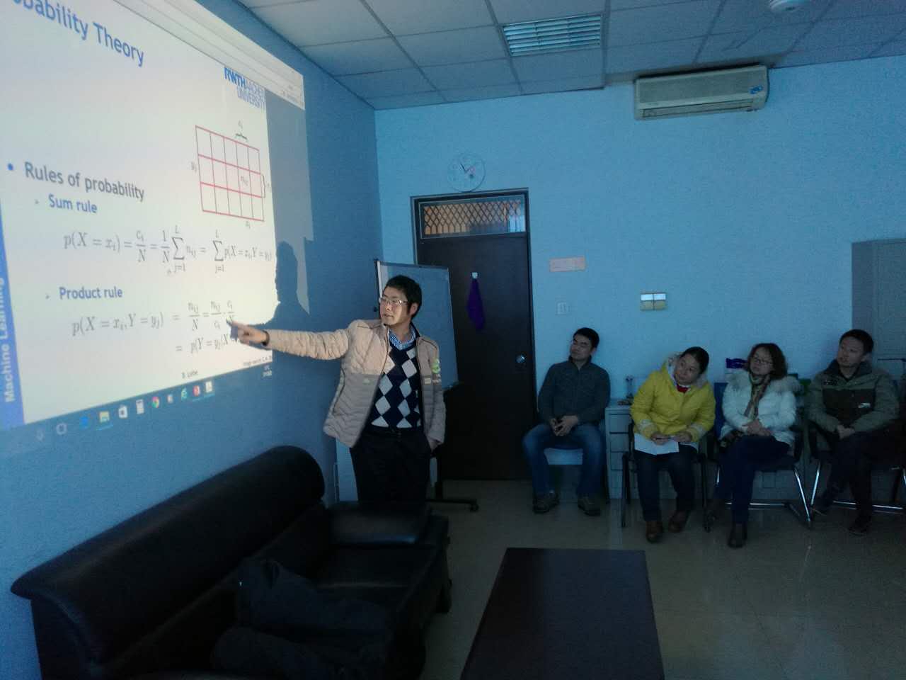 老师们在北区基础实验楼706参加了模式识别和机器学习系列讲座第一讲。这一讲,由杨关博士给大家讲解学科基础知识。杨老师结合具体实例和研究经验给大家着重讲了模型选择中的过拟合,贝叶斯估计、最大似然、最大后验概率的联系,高斯分布中的协方差,正则化优化式中的惩罚项。刘卫光院长根据现场老师专业研究基础参差不齐的情况,穿插给大家详细地举例讲解了分类的概念、机器学习的关键问题、概率论的基础知识、贝叶斯决策论的基本概念。讲座的最后,老师们达成一致,每星期抽出一次时间由杨老师加补一次数学基础。