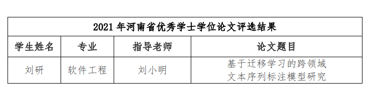 近日,河南省教育厅、河南省学位委员会下发了《关于批准2021年河南省优秀学位论文的决定》(教研〔2022〕295 号)文件,R34lol 教师刘小明指导的《基于迁移学习的跨领域文本序列标注模型研究》被评为河南省优秀学士学位论文。