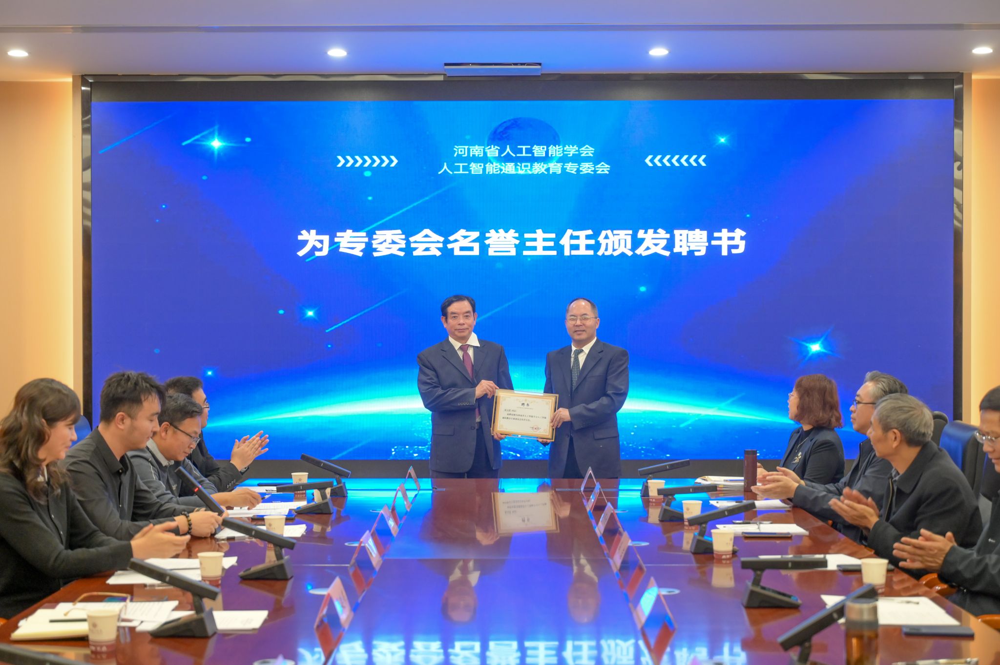 会上,集中学习习近平总书记关于人工智能的重要论述,深刻领会国家关于人工智能的战略部署。马广建宣读河南省人工智能学会关于专委会的批复文件,并为专委会授牌。吴廷伟为夏元清颁发专委会名誉主任聘书,路杨为张书钦颁发专委会主任聘书。