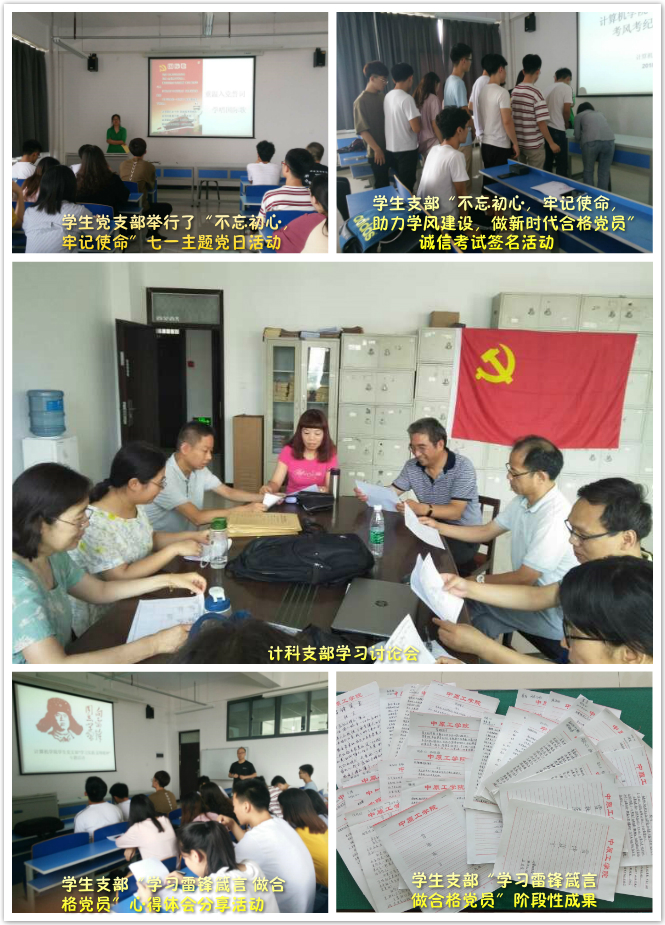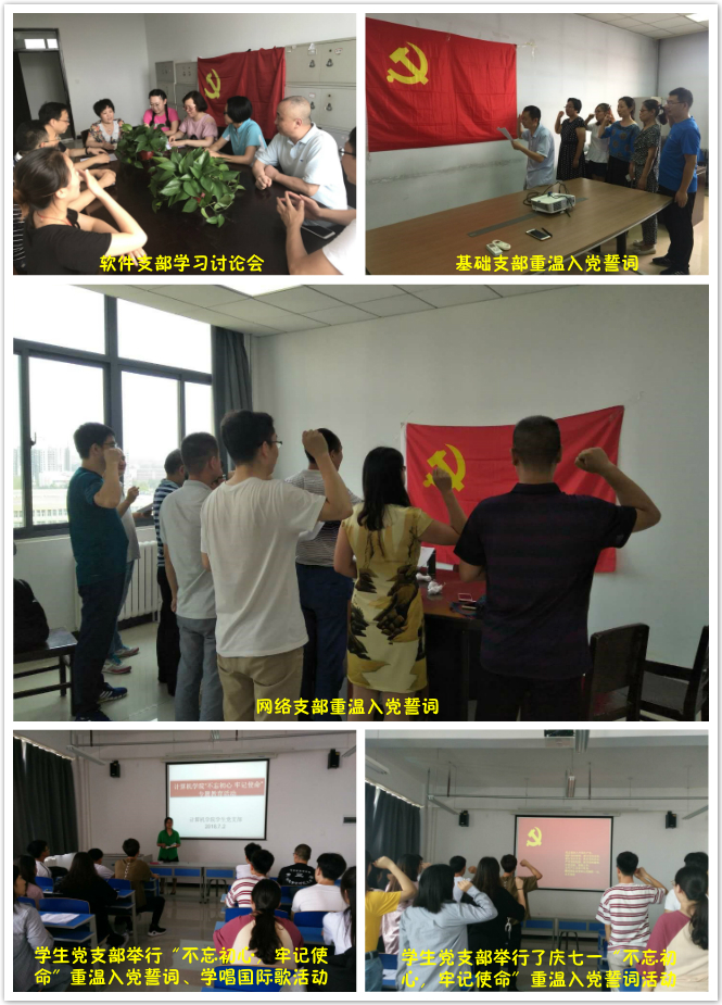 各个支部分别传达了校党委下发的《中共河南省委组织部关于在“七一”期间认真组织开展以“不忘初心、牢记使命”为主题的支部党日活动的通知》,各个支部还开展了“庆七一”重温入党誓词仪式和讨论会。