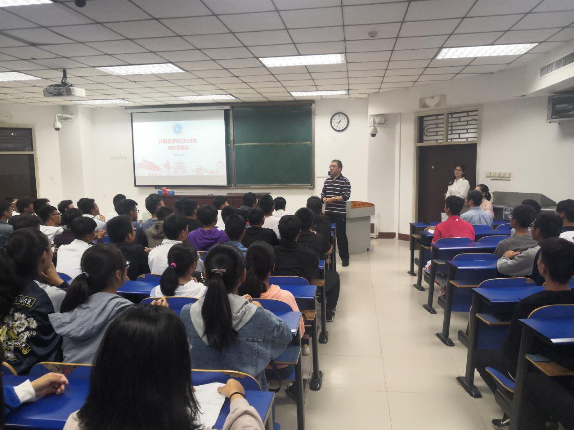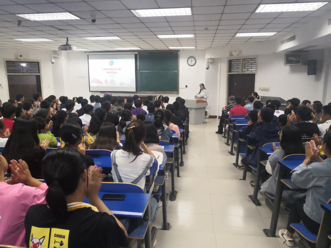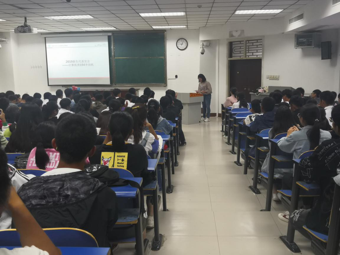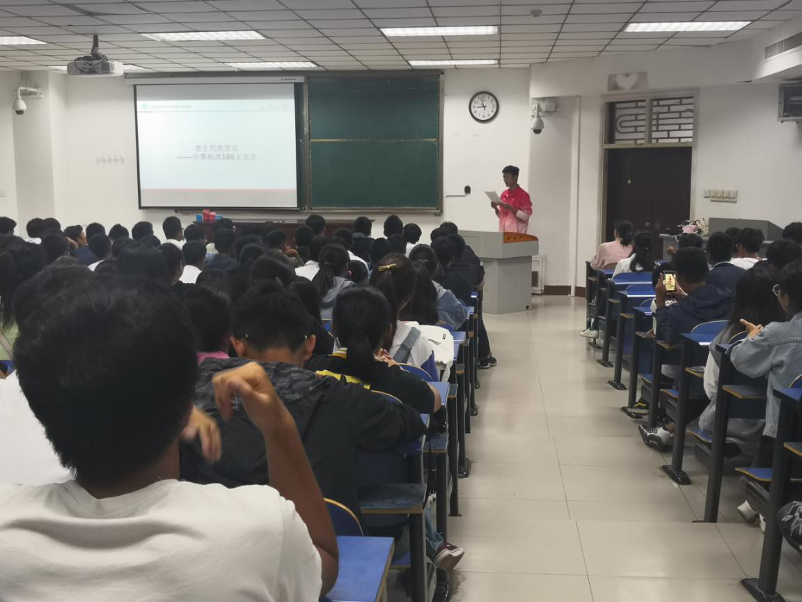的办学理念和师资力量,专业的培养方向和发展前景,寄语2019级新生成为有责任、有目标、有担当的新时代大学生。之后,老生代表计算机类186班学生王北京及2019级新生代表计算机类194班学生李扬帆分别在会上做了发言。
