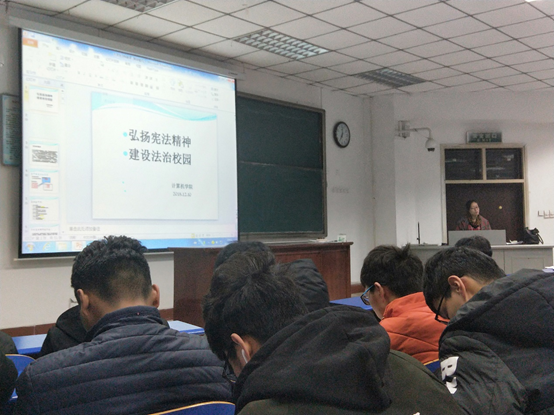 20181210日,学工办主任侯向花老师于四号楼101教室以“弘扬宪法精神,建设法治校园”为主题做出宣讲。R34lol 18级全体学生出席本次讲座。
