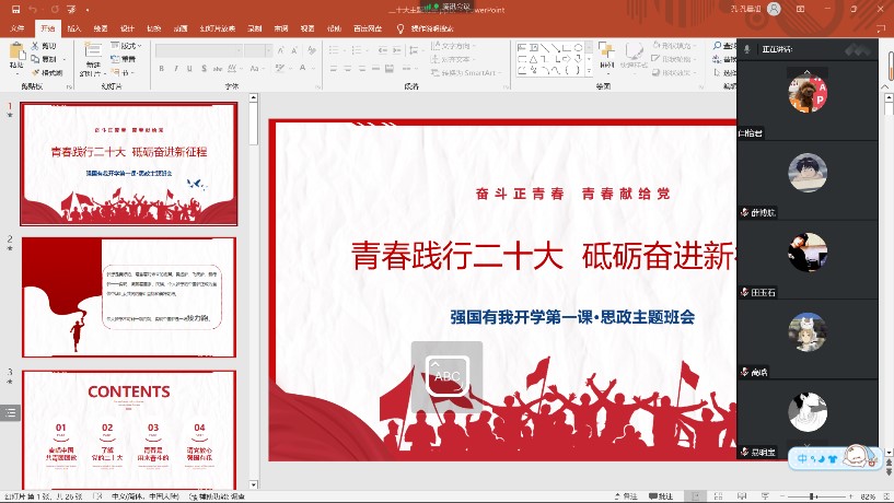 各班级根据青春践行二十大的主题,围绕“爱国、团结、奋斗、科学、互助”五个关键词开展讨论。号召同学作为青年应深知“青年强,则国家强”,努力学习,做有理想、敢担当、能吃苦、肯奋斗的新时代好青年。