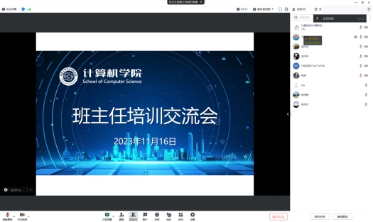 举行2023年职业生涯规划大赛班主任培训线上交流会,学院党委副书记侯向花、负责院级职业生涯选拔赛组织的王腾老师以及全体班主任参加。