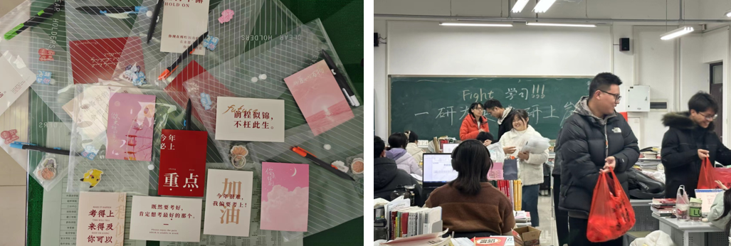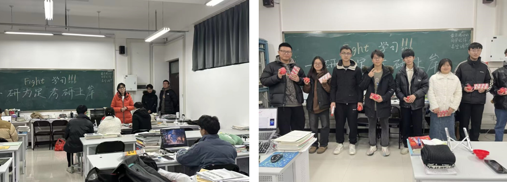 为考研学生送上衷心祝福和暖心礼物。经学工办策划,本科生和研究生党支部联合行动,12月21日到学院考研专用教室慰问24届考研学生,给大家送上学院精心准备的心想事成橙子、才气旺运气旺的旺仔牛奶、考试棒棒哒的棒棒糖、励志胸针,研究生学长和党员学弟妹亲手书写满是心意的祝福贺卡,以及学院给大家准备的考研文具等大礼包。党委副书记侯向花、组织员姜茜老师为即将踏上考场的学子们送去鼓励与祝福,勉励大家放松身心、稳住心态,展现最佳状态,祝愿成功上岸。研二研一学长,也为考研学弟学妹传经送宝,传授心得,加油鼓劲!R34lol
