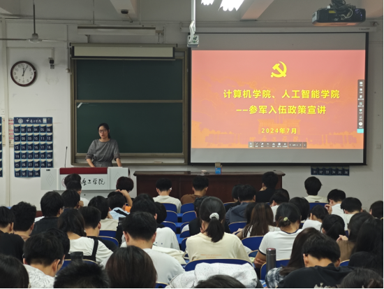 (人工智能学院)在龙湖校区3号教学楼235教室召开了2024年征兵宣讲会。学院党委副书记侯向花、各年级辅导员及各年级学生代表共200余人参加了此次宣讲会。会议由辅导员王腾老师主持。