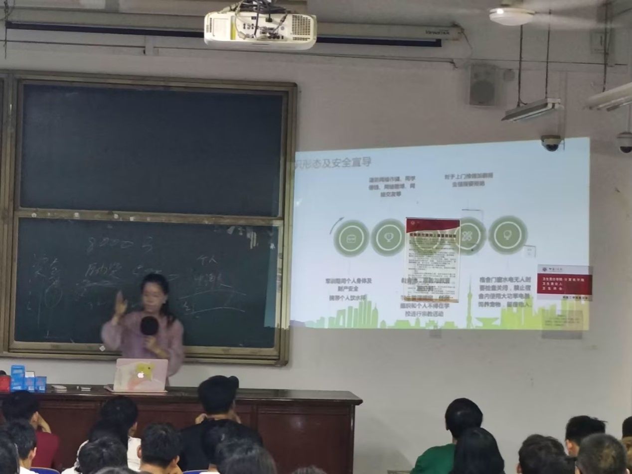 接着,孙老师向大家介绍了接下来军训的日程安排,并对新生关心的困难认定、高校贷款、医保政策、助学金评定、以及意识形态安全等事项进行了政策宣导。