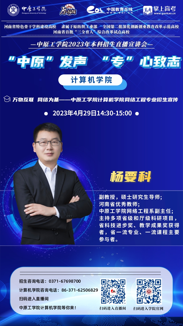 专业特色:本专业自2003年开始招收本科生,是国内最早一批网络工程专业。2009年建成河南省特色专业,2013年建成河南省专业综合改革试点专业,2022年建成河南省一流本科专业,拥有河南省网络工程教学团队,建有河南省网络安全虚拟仿真实验教学中心、河南省网络舆情监测与智能分析重点实验室、河南省本科高校大学生校外实践基地等。近三年获省部级及以上教学成果10余项,建成省级一流课程4门、国家及省级优质教材10余部,专业学生参与全国高校互联网应用创新大赛、华为ICT大赛、中国高校计算机大赛网络技术挑战赛各类学科竞赛活动屡获佳绩。