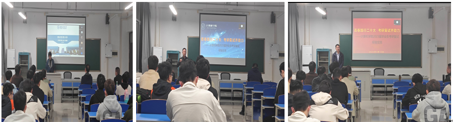 侯老师首先介绍了参会嘉宾,进行了学院2023届学生考研初试情况简要分析。经验分享正式开始,首先由22年考取西安电子科技大学的计科18王强强学长,从联系导师学长、自荐信撰写、笔试准备、机试准备等多方面做了备考过程详细分享。22年考取北京邮电大学的信息安全18王佳豪学长也讲述了他个人在去年考研复试中的经验得失。接下来许进忠和王璐老师也各自从研究生指导教师角度,对考研复试同学提出诸多中肯建议。最后由R34lol